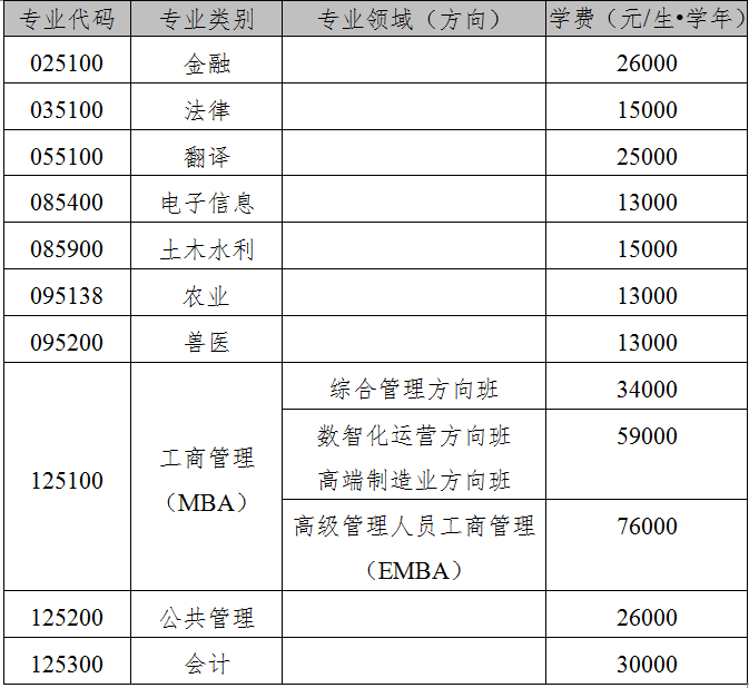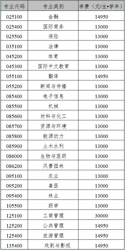 各学科专业按年缴纳学费,缴纳次数为学制年数。具体学费标准如下: