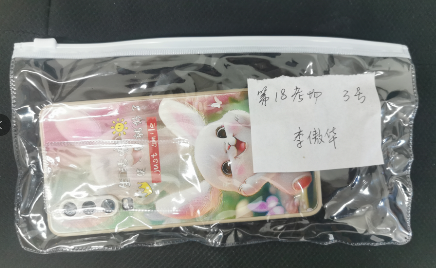 4、如有特殊情况考生手机需在考试封闭管理区域外委托放置,须用小型文具袋或纸张先行将手机包裹,作上记号(考场号和座位号),如本通知底部例图,考试结束后凭准考证领取;