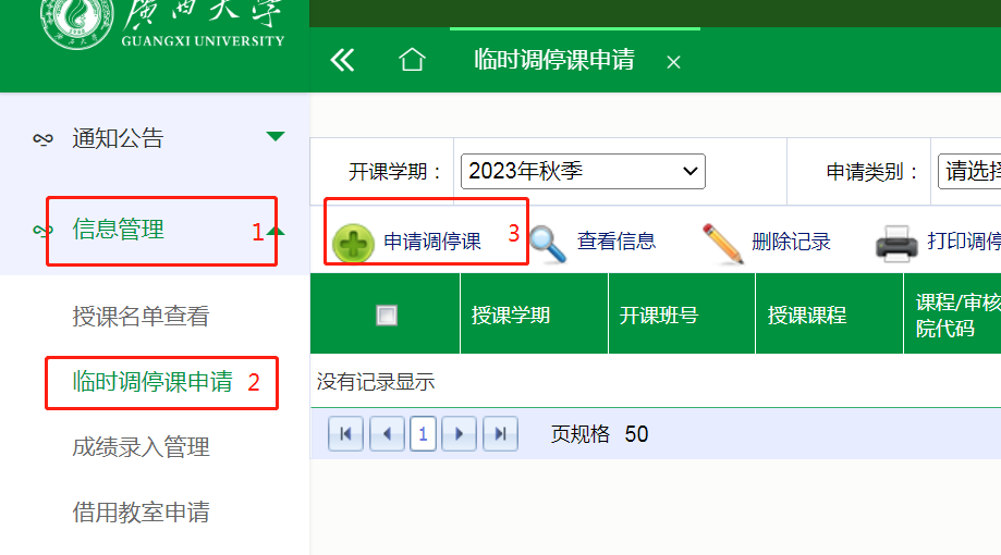 (一)任课教师必须在研究生综合管理信息系统上办理调停课申请,切换到教职工角色,具体操作流程如下:1信息管理—2临时调停课申请—3申请调停课。任课教师在系统中提交申请后,由开课单位和研究生院在系统上审批确认。