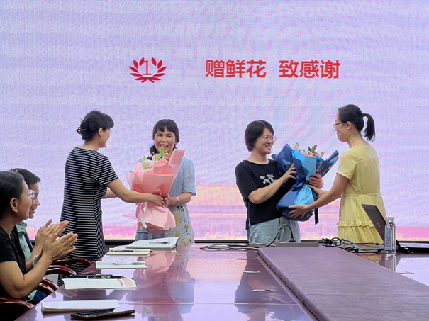 研究生院全体同志为即将退出教育管理岗位的蓝芳同志,以及调离研究生院岗位的刘苑同志送上鲜花,大家逐一回顾与两位老师一起奋战的日夜,一张张照片从屏幕上滑过,令人忍不住回想起往事的点点滴滴,一起追忆奉献的青春年华,感念互助互爱的同志情谊、苦中作乐的快乐时光,并为两位老师开启新生活送上真挚祝贺与诚挚的祝福。刘小玲同志指出,每位一起共事过的同志都是学校研究生教育战线大家庭中的一员,希望大家离岗不离家,时常回家,继续关心支持学校的研究生教育工作。