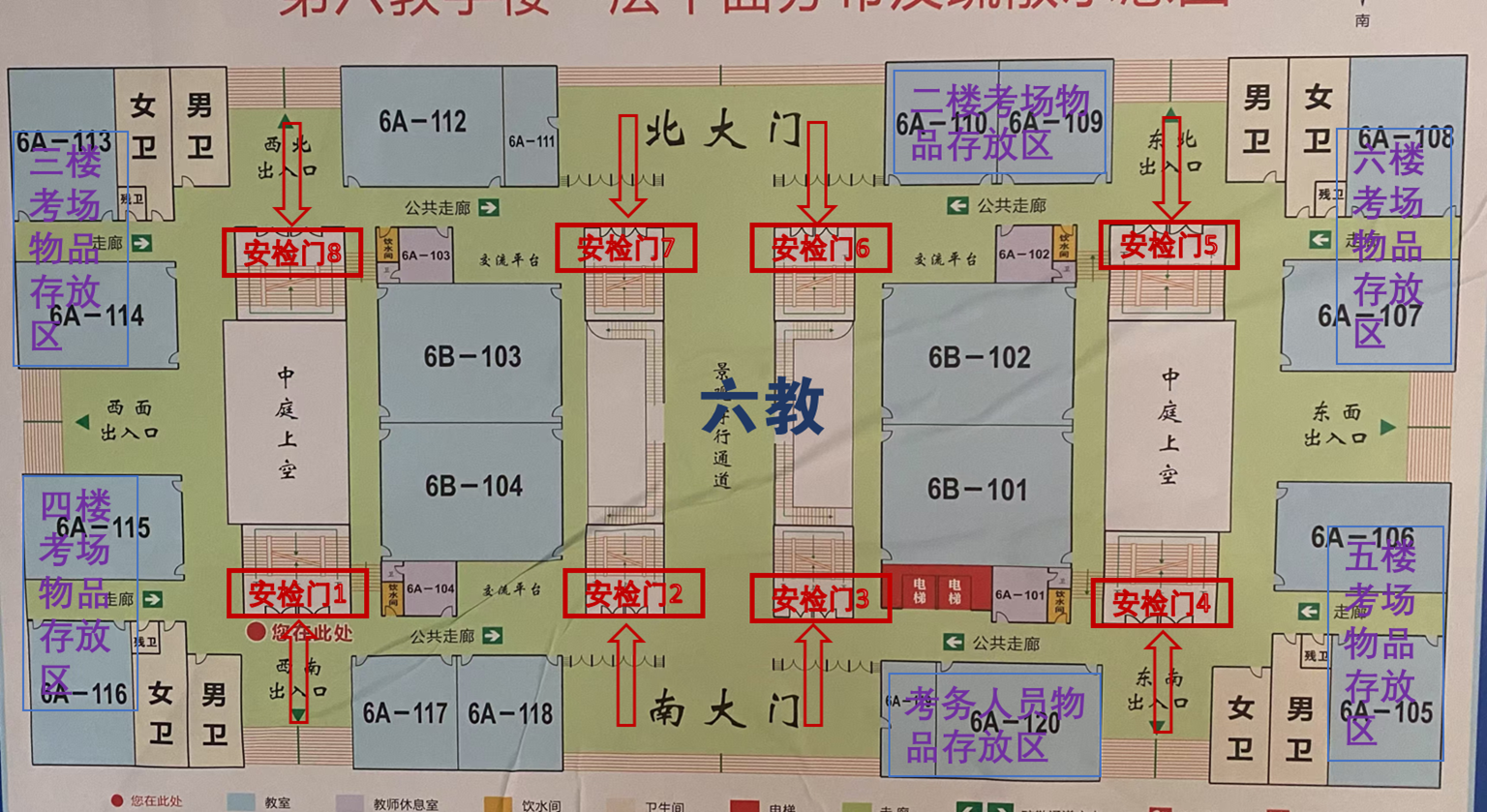 2.考生个人贵重物品请勿携带到考点。考生存放物品区域设置在第六教学楼1楼教室(详见附件2)及第二教学楼5楼大厅,考点不负责保管考生个人物品安全。