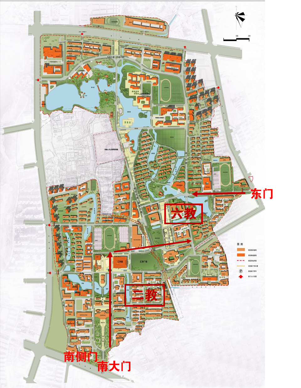抵达楼栋:校园主干道旁设置了考场楼栋(第六教学楼或第二教学楼)引导指示牌,考生及家长可自行选择在校门附近乘车点乘坐校园摆渡车、骑行共享单车或步行等方式抵达考场楼栋(详见附件1)。