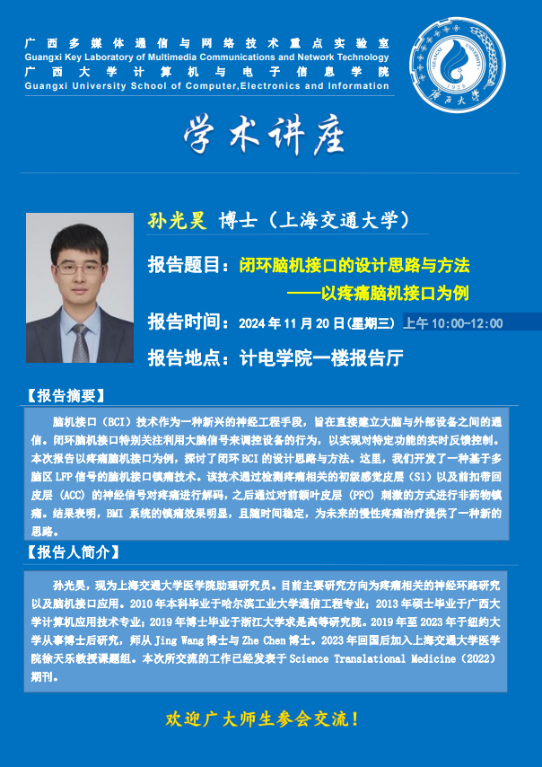 “古天乐代言太阳集团网址”第23期学术报告:闭环脑机接口的设计思路与方法——以疼痛脑机接口为例