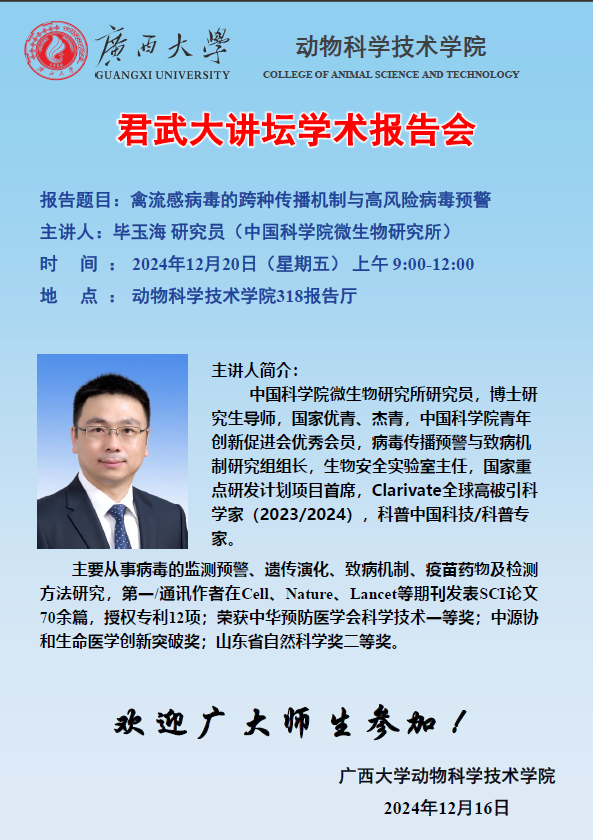 君武大讲坛、动物科学技术学院学术报告:禽流感病毒的跨种传播机制与高风险病毒预警