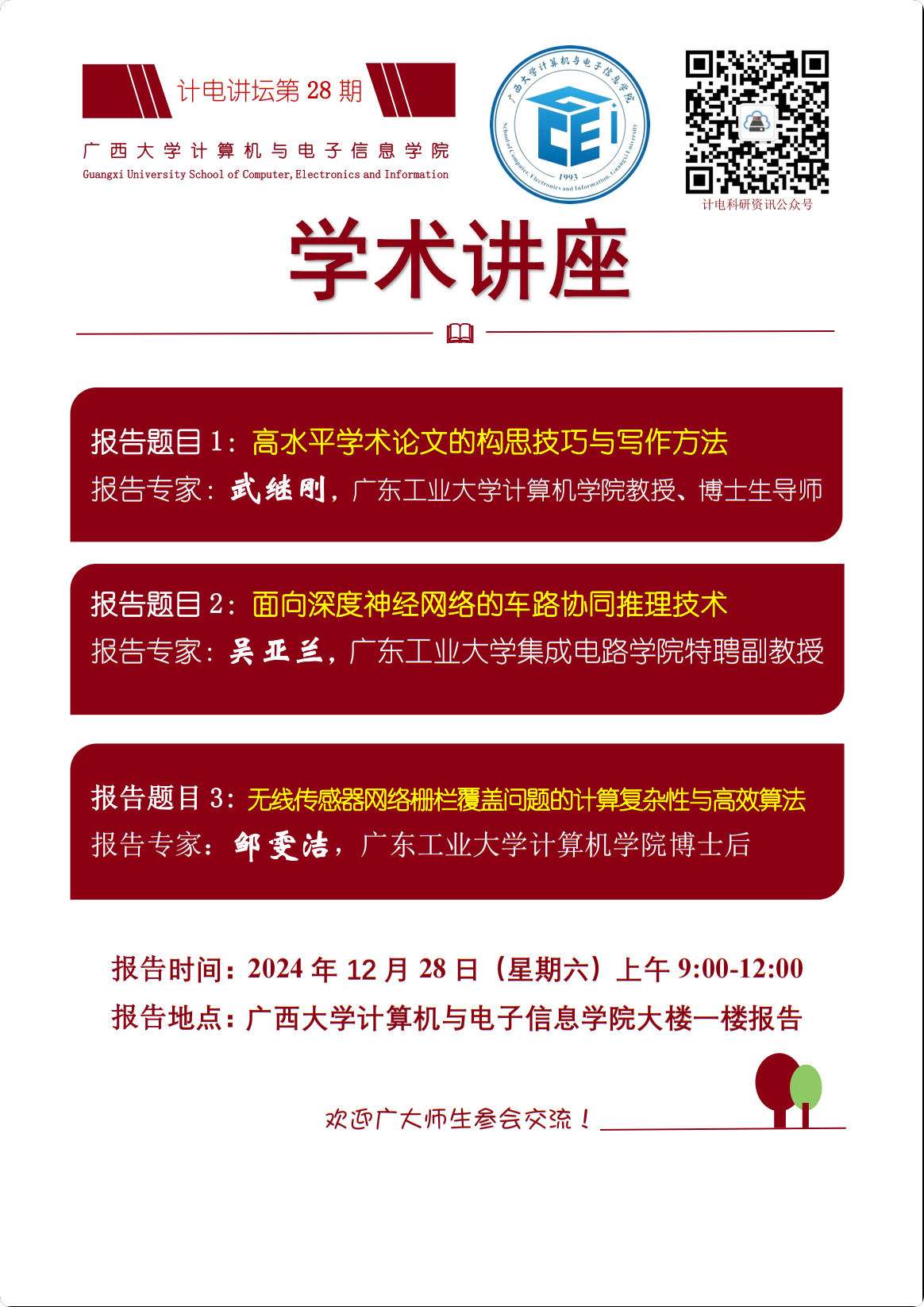 “古天乐代言太阳集团网址”系列活动第28期学术报告会:1.高水平学术论文的构思技巧与写作方法;2.面向深度神经网络的车路协同推理技术;3.无线传感器网络栅栏覆盖问题的计算复杂性与高效算法