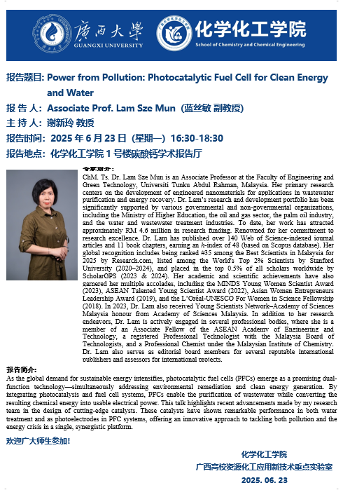化学化工学院学术报告:Power from Pollution: Photocatalytic Fuel Cell for Clean Energy and Water