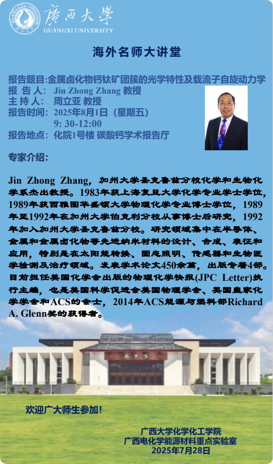 化学化工学院海外名师大讲堂:金属卤化物钙钛矿团簇的光学特性及载流子自旋动力学